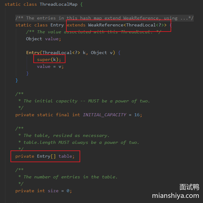 这个 Entry 继承了 WeakReference 即弱引用。这里需要注意,不是说 Entry 自己是弱引用,看到我标注的 Entry 构造函数的 super(k) 没,这个 key 才是弱引用。