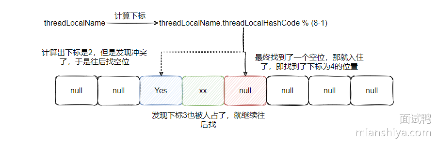 可以看到,这种 hash 冲突的解决效率其实不高,但是一般 ThreadLocal 也不会太多,所以用这种简单的办法解决即可。