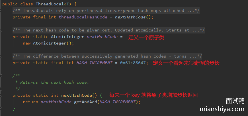 注意看上面都是静态变量和静态方法,所以在 ThreadLocal 对象之间是共享的,然后通过固定累加一个奇怪的数字0x61c88647