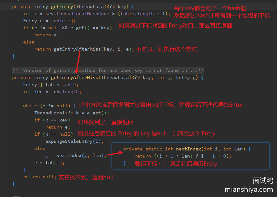 所以说,如果通过 key 的哈希值得到的下标无法直接命中,则会将下标 +1,即继续往后遍历数组查找 Entry ,直到找到或者返回 null。
